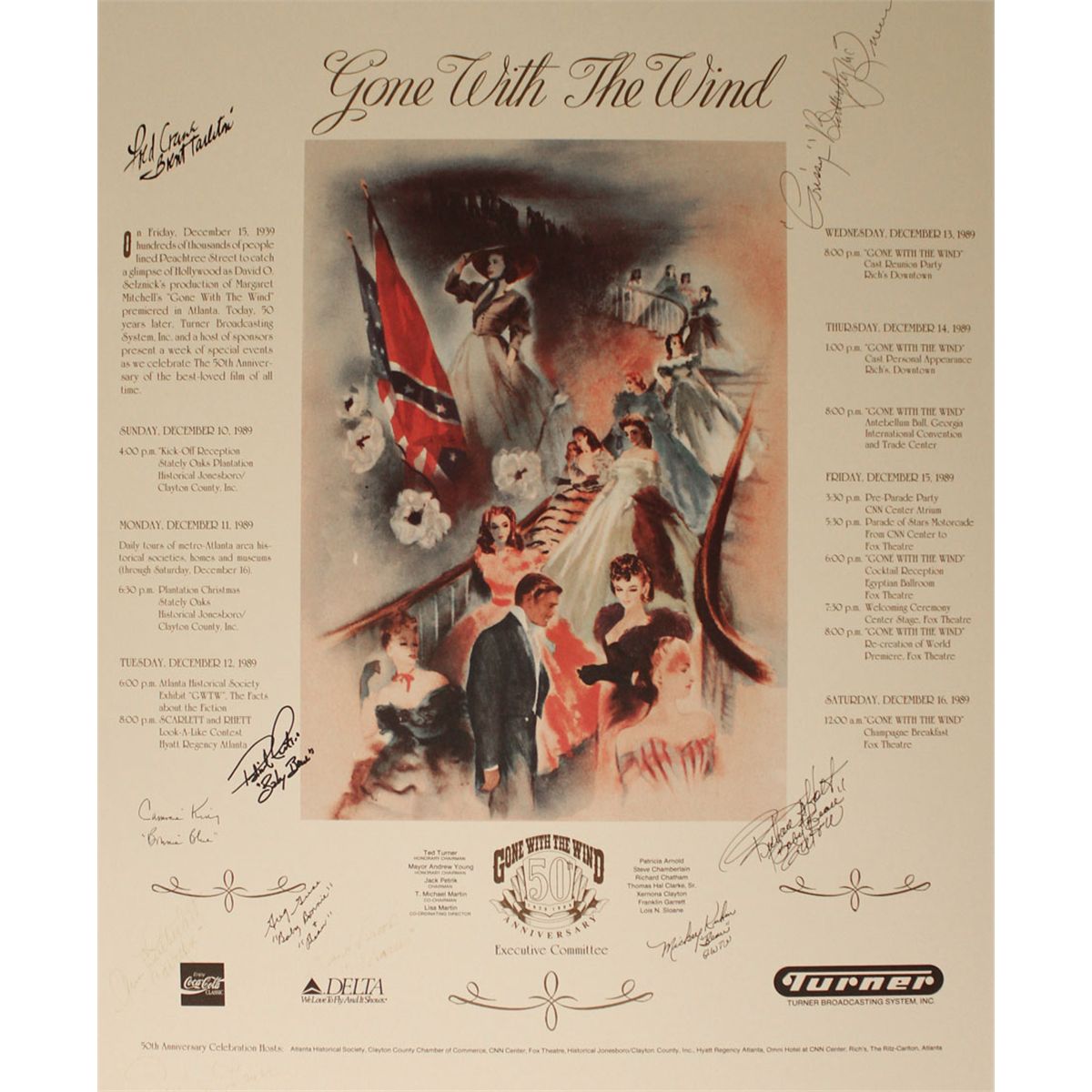 ''Gone With The Wind'' poster signed by cast members Fred Crane as ''Brent Tarleton,'' Butterfly McQueen as ''Prissy,'' Patrick Curtis as ''Baby Beau,'' Cammie King as ''Bonnie Blue,'' Greg Grise as ''Baby Beau & Beau,'' Mickey Kuhn as ''Beau,'' and Barbara Holt as ''Baby Beau.'' Signatures of Rand Brooks as ''Charles,'' Ann Rutherford as ''Careen,'' and Evelyn Keyes as ''Suellen O'Hara'' are considerably faded. This ''Gone With The Wind'' 50th anniversary commemorative poster is mounted on pliable cardboard and measures 23'' x 25.'' Near fine condition.