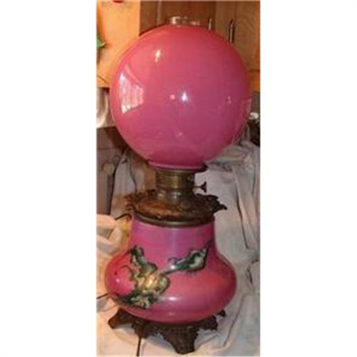 Very unusual dark pink Gone with the Wind style lamp with oriental bird and fish designs. Excellent condition with no nicks, chips or cracks. Hurricane shade included.