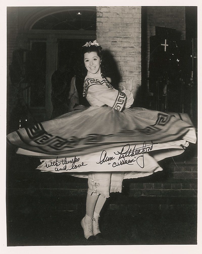 Glossy 8 x 10 photo of Rutherford twirling in her dress, signed in black felt tip, “With thanks and love, Ann Rutherford, ‘Carreen.’” In fine condition, with a small area of irregular finish near top.