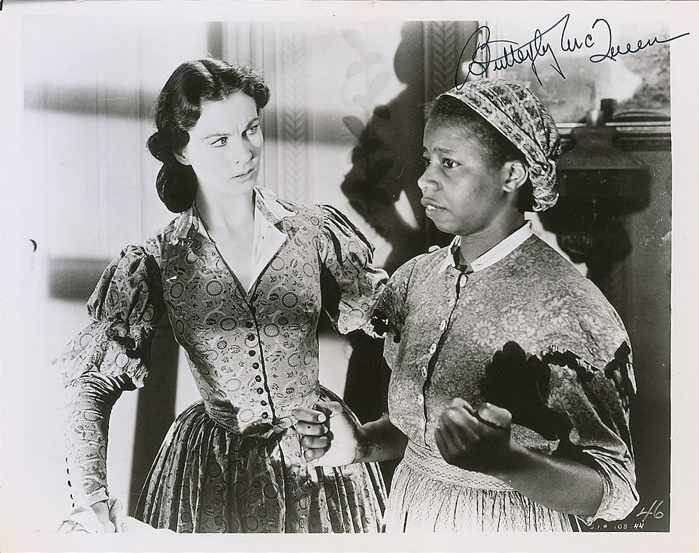 Glossy 10 x 8 photo of Scarlett O’Hara and Prissy from Gone With the Wind, signed in black felt tip by McQueen. In fine condition, with a few scattered light surface marks.