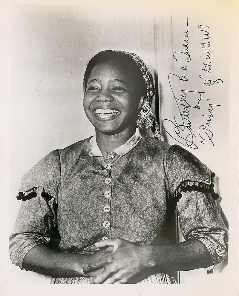 Glossy 8 x 10 photo of McQueen in Gone With the Wind, signed vertically in black felt tip “Butterfly McQueen, ‘Prissy’ of ‘G. W. T. W.’” Three slight binder dings to left edge and some toning to the top border, otherwise fine condition.