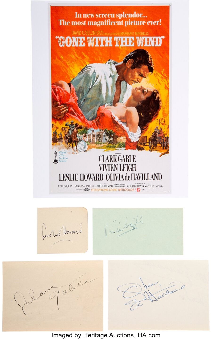 Gone With the WindCast Signatures. A collection of signatures from four stars of the Civil War epic, along with the signature of Laurence Olivier (who was married to Vivien Leigh from 1940 until 1960). Lot includes four cut sheets of various sizes (largest is 3 ½" x 5"). Signatures include Clark Gable (in black ink), Leslie Howard, Vivien Leigh (with Olivier's signature on verso), and Olivia de Haviland (in blue ink). Includes a card from Julien's, who previously sold this lot. Comes with a promo photo for display purposes only. COA from Heritage Auctions.