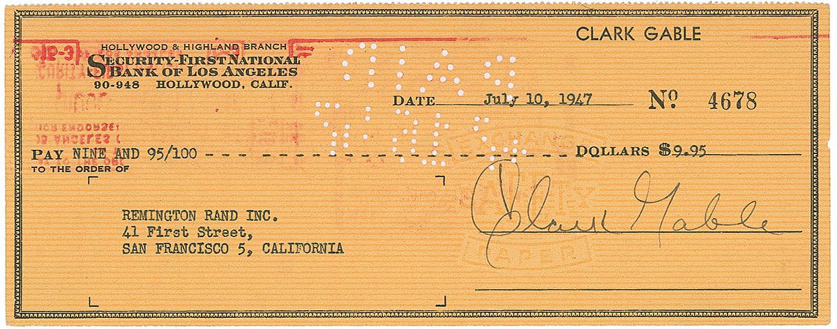 Personal check, 8.25 x 3.25, filled out in type and signed by Gable, payable to Remington Rand Inc. for $9.95, July 10, 1947. In fine condition, with expected stamps and holes, a couple holes slightly touching first letter of signature, and a PSA/DNA authentication label affixed to reverse.
