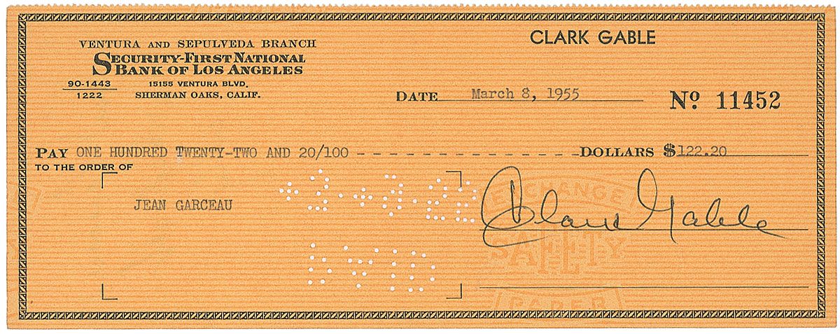 Extremely crisp personal check, 8.25 x 3.25, filled out in type and signed by Gable, payable to Jean Garceau for $122.20, March 8, 1955. In fine condition, with expected cancellation holes.