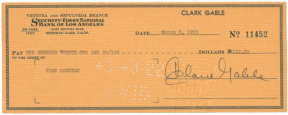 Personal check, 8.25 x 3.5, filled out in type and signed by Gable, payable to Jean Garceau for $122.20, March 8, 1955. In fine condition, with cancellation holes next to signature. Garceau was Carole Lombard’s secretary until her death in 1942, then served as Gable’s secretary.