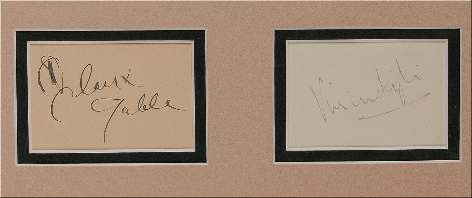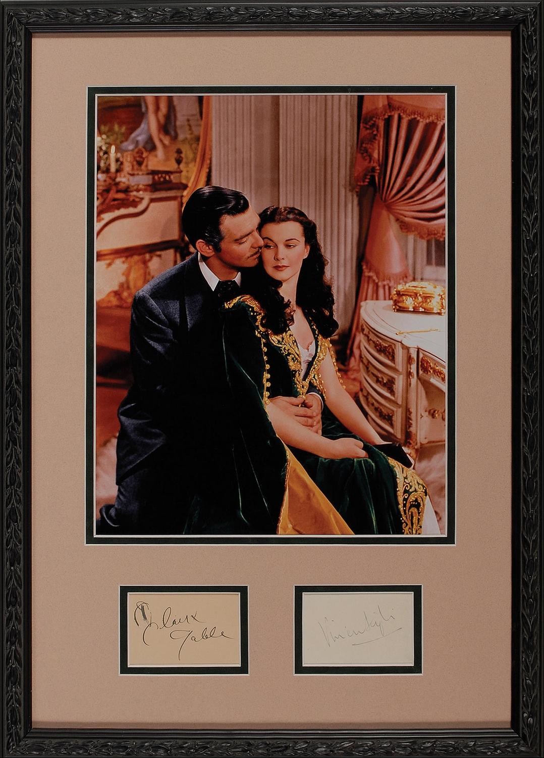 Fabulous vintage ink signatures of Clark Gable and Vivien Leigh on individual 3.5 x 2.25 album pages. Double matted and framed with a gorgeous, crystal clear unsigned 11 x 14 color photo of Rhett and Scarlett, to an overall size of 17 x 24. In fine condition, with some brushing to Clark Gable’s signature. Exceptionally attractive display piece.