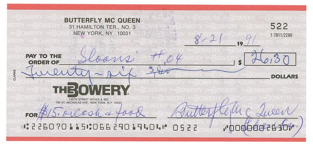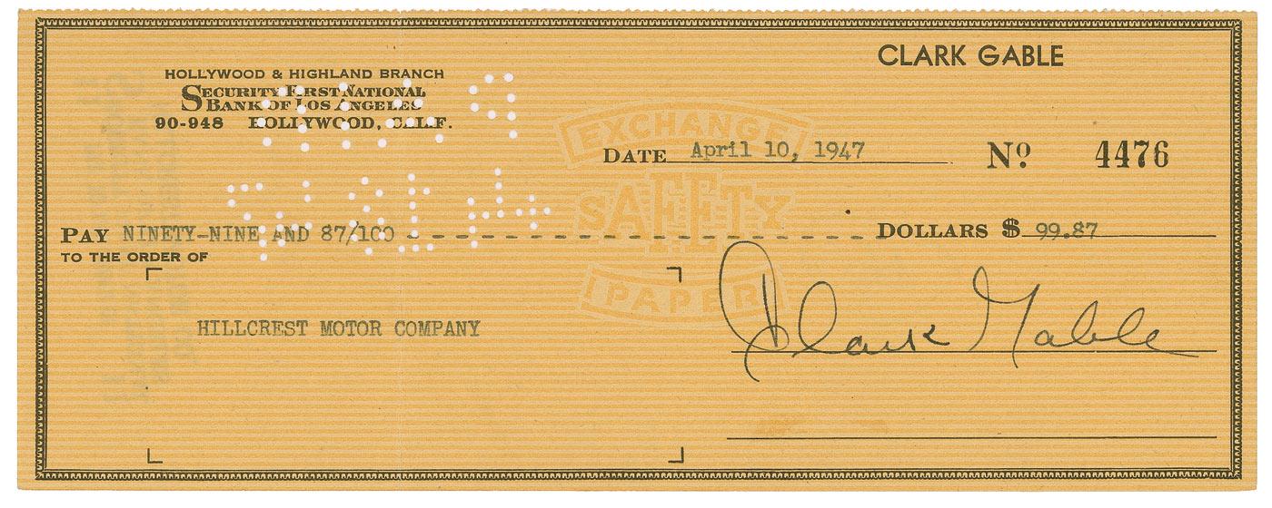 Two personal checks: one 8.5 x 3.25, filled out in type and signed by Clark Gable, payable to Hillcrest Motor Company for $99.87, April 10, 1947; and one 6 x 3, filled out in blue ballpoint and signed by Butterfly McQueen payable to Sloan’s for $26.30, August 21, 1991. In fine condition, with a vertical fold, expected cancellation holes, and a small spot of adhesive to the Gable check, and show-through from stamps on reverse of the McQueen check, none affecting the clean signature area.