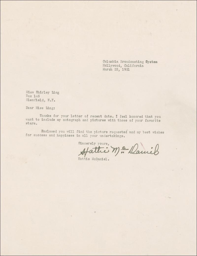 American actress (1895–1952) who earned a place in Hollywood history as the first African-American performer to win an Academy Award for her memorable turn as Mammy in Gone With the Wind. TLS, one onionskin page, 8.5 x 11, March 22, 1951. Letter to an admirer. In full: “Thank you from your letter of recent date. I feel honored that you want to include my autograph and pictures with those of your favorite stars. Enclosed you will find the picture requested and my best wishes for success and happiness in all your undertakings.” In fine condition.