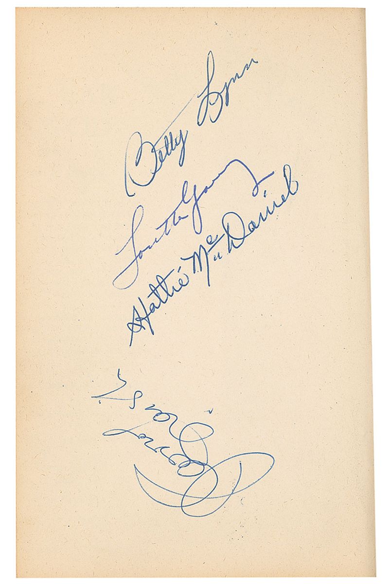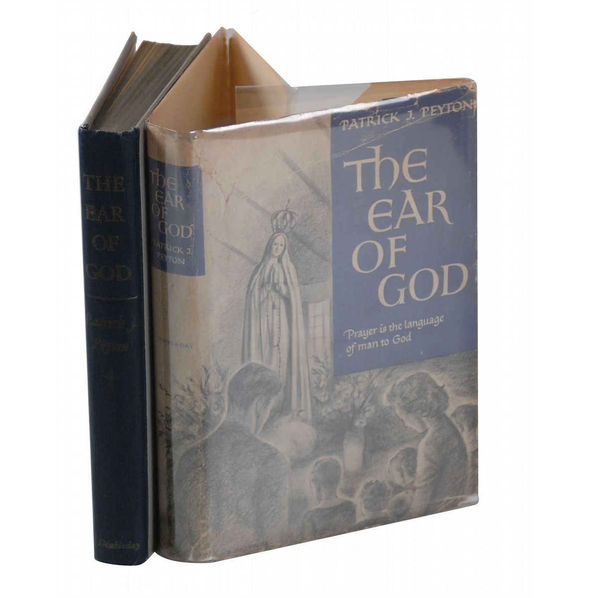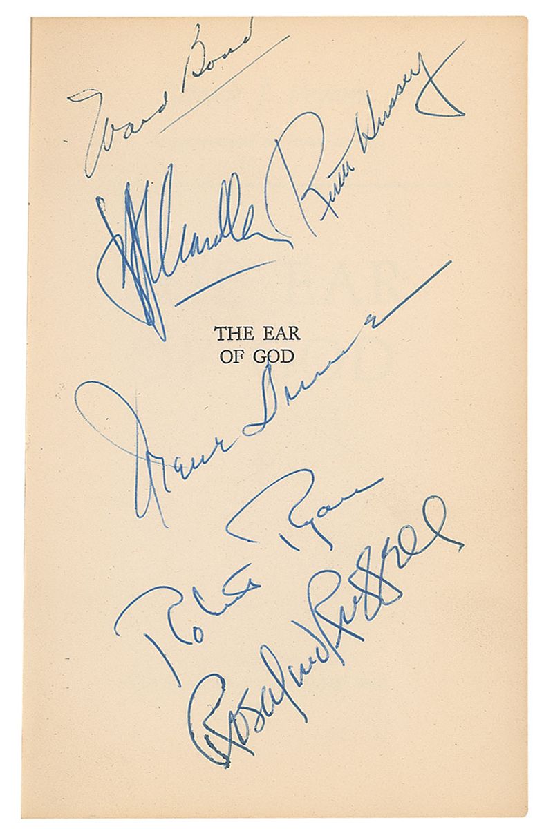 Signed book: The Ear of God by Patrick J. Peyton. Garden City, NY: Doubleday, 1951. Hardcover with dust jacket, 5.5 x 8, 226 pages. Signed on a free end page and half-title and opposing page in blue ink by ten actors. Signers are: Hattie McDaniel, Ward Bond, Jeff Chandler, Irene Dunne, Ruth Hussey, Betty Lynn, J. Carroll Naish, Robert Ryan, Rosalind Russell, and Loretta Young. Also signed on the first free end page by the author. Autographic condition: fine. Book condition: VG+/VG-. Navy cloth-covered spine and grey cloth-covered boards; light wear to edges, with few small tears in cloth along lower edges; gilt lettering on spine darkened; slightly shaken; yellowed. Dust jacket in protective mylar sleeve; small chips/tears and creases along edges and folds; one larger tear (approximately 1.75?) to front upper edge with long horizontal creases to flap fold; yellowed; moderately soiled and rubbed; price-clipped.