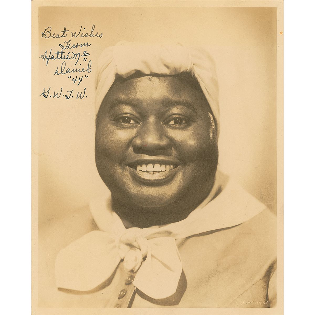 American actress (1895–1952) who earned a place in Hollywood history as the first African-American performer to win an Academy Award. Rare vintage matte-finish 8 x 10 head-and-shoulders portrait of McDaniel in her classic role as Mammy in Gone With the Wind, signed in fountain pen, “Best Wishes, from Hattie McDaniel, ‘44,’ G.W.T.W.” In fine condition. Exceptionally rare and highly desirable, this is just the third photo of McDaniel in her iconic role that we have ever offered—and the first uninscribed example in over a decade.