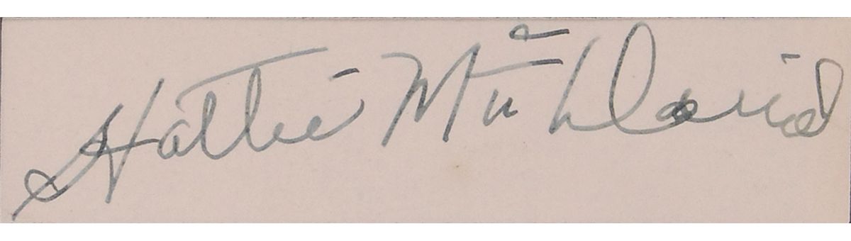 Fountain pen signature, “Hattie McDaniel,” on an off-white 3.5 x 1 slip. Attractively double-matted and framed with a photo of McDaniel in her role as Mammy to an overall size of 11 x 14. In fine condition.