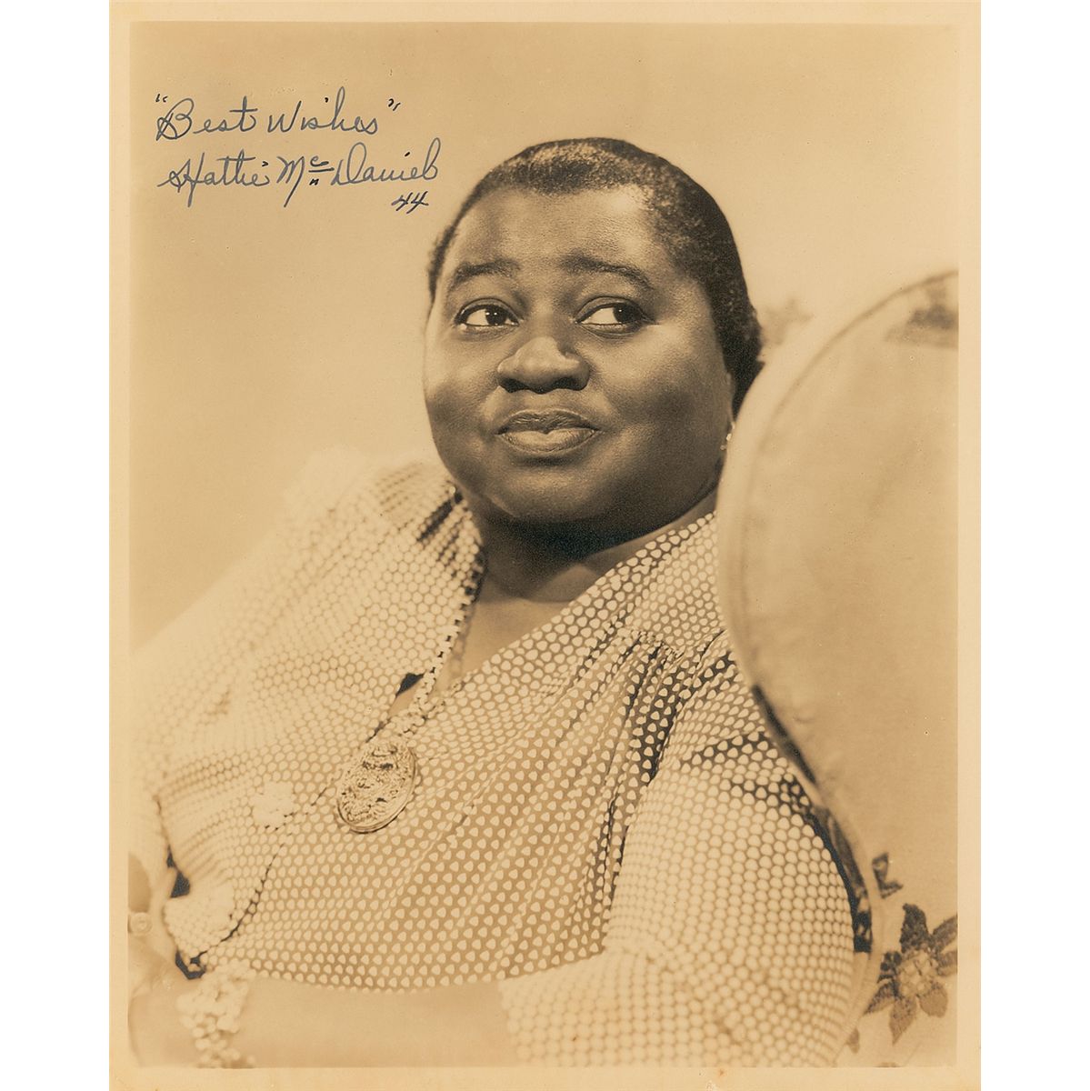 Actress (1895–1952) who earned a place in Hollywood history as the first African-American performer to win an Academy Award for her memorable turn as Mammy in Gone with the Wind. Scarce vintage matte-finish 8 x 10 photo of McDaniel in a housemaid costume similar to Mammy’s, boldly signed in fountain pen, “‘Best Wishes,’ Hattie McDaniel, 44.” In fine condition, with a few trivial creases. An immensely desirable piece with a bold, crisp signature.