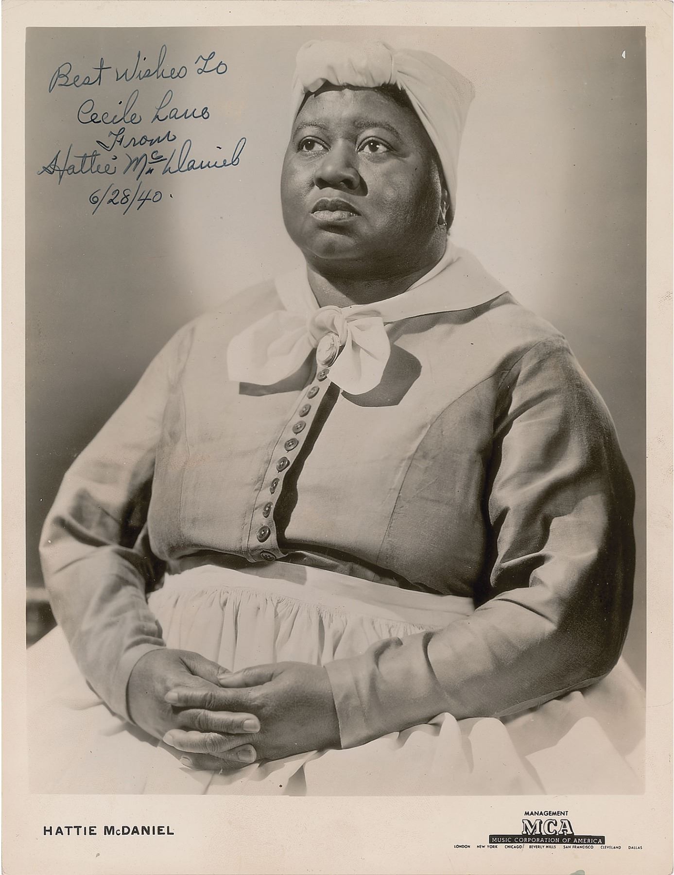 Extraordinary vintage glossy 8 x 10 MCA publicity photo of McDaniel in her iconic role as Mammy in Gone With the Wind, boldly signed and inscribed in fountain pen, "Best Wishes to Cecile Lane, From Hattie McDaniel, 6/28/40.” In fine condition, with a tiny fleck of emulsion loss to the upper right corner. A scarce and sought-after portrait.