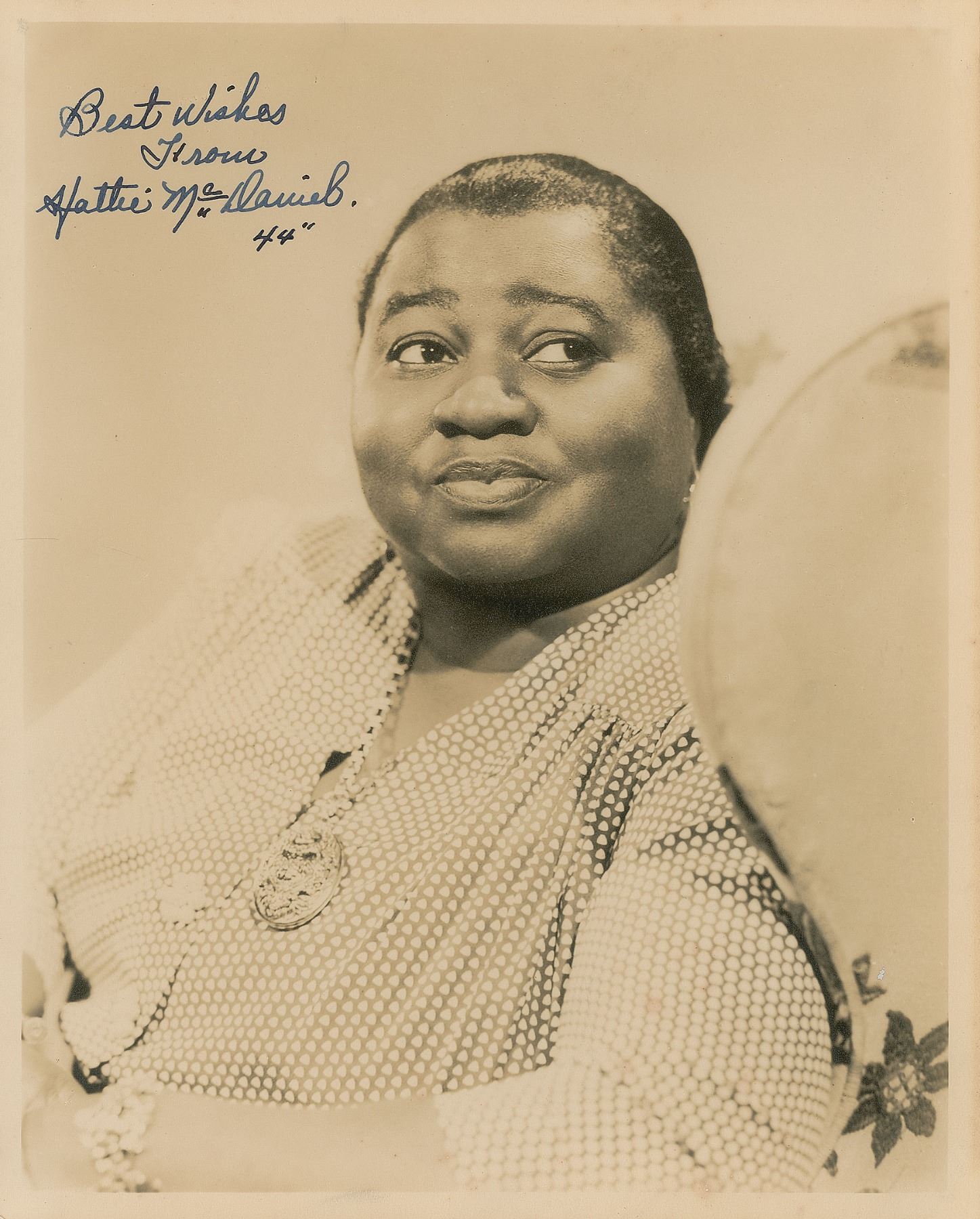 Vintage matte-finish 8 x 10 photo of McDaniel shown in a pleasant seated pose, signed in fountain pen, "Best wishes from Hattie McDaniel, 44.'" In fine condition. In winning an Academy Award for her role as Mammy in Gone With the Wind, McDaniel earned a place in Hollywood history as the first African-American performer to win an Oscar.