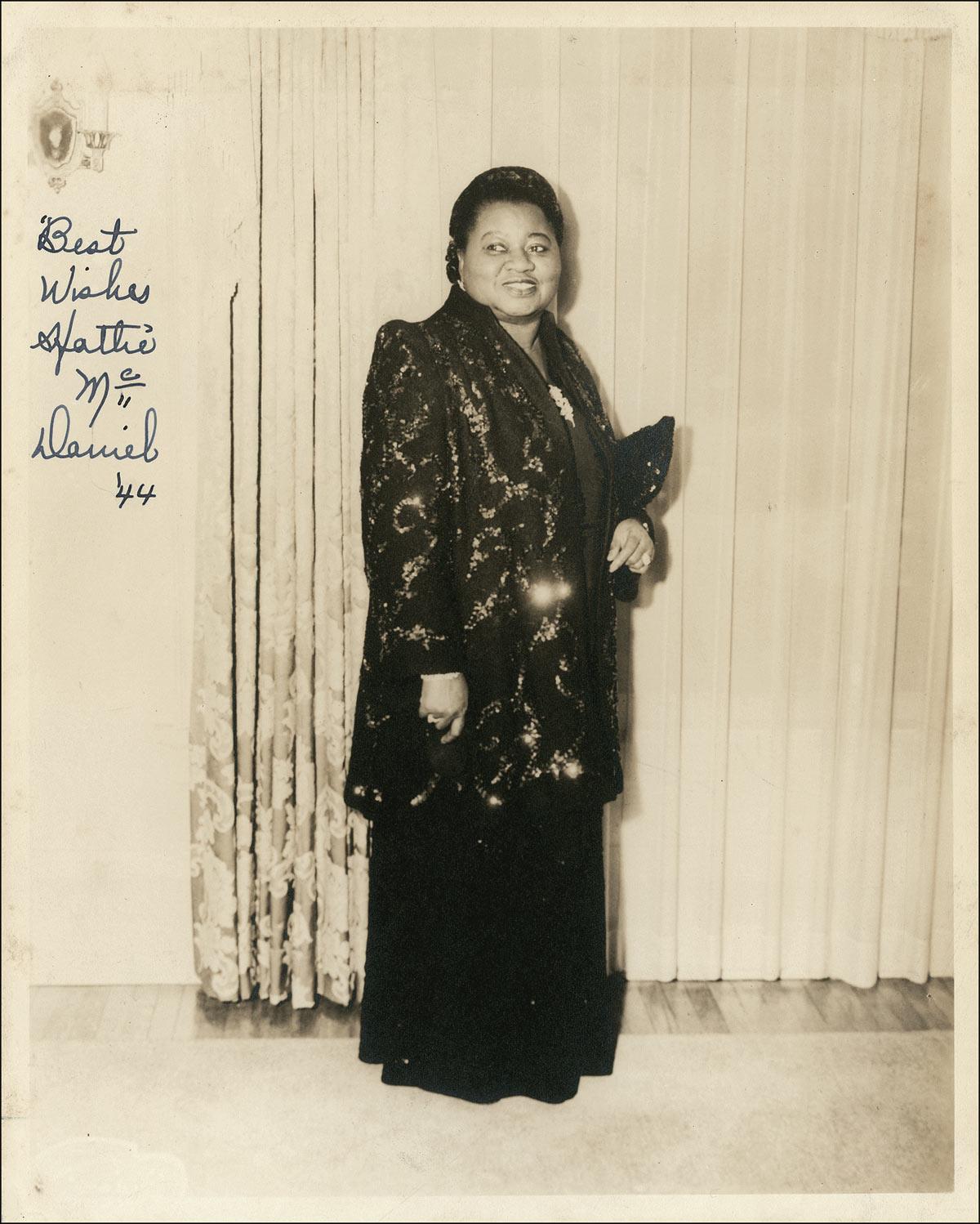 American actress (1895–1952) who earned a place in Hollywood history as the first African-American performer to win an Academy Award, for her memorable turn as Mammy in Gone With the Wind. Elegant vintage matte-finish 8 x 10 full-length photo of McDaniel in an evening gown and jacket, signed in fountain pen, “Best wishes, Hattie McDaniel ‘44.” Some scattered light creasing and soiling to edges, as well as a bit of light silvering to darker portions of image, otherwise fine condition. Accompanied by a letter of authenticity from James Spence. Pre-certified PSA/DNA and RRAuction COA.