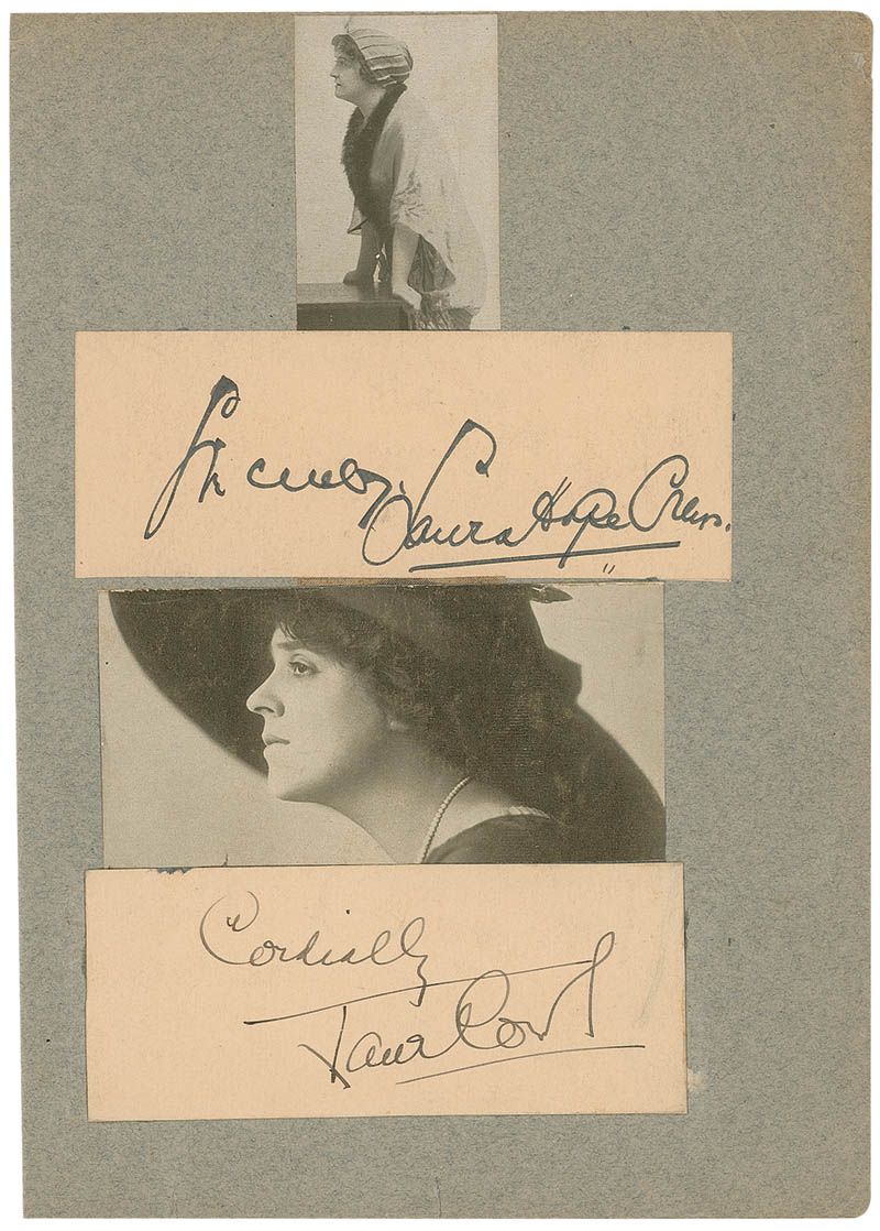 Fountain pen signature, “Sincerely, Laura Hope Crews,” on an off-white 6 x 2.5 trimmed card. Card is affixed to a 7.75 x 11 scrapbook page, along with a small photo, as well as a fountain pen signature of Jane Cowl, and another small photo. In fine condition.