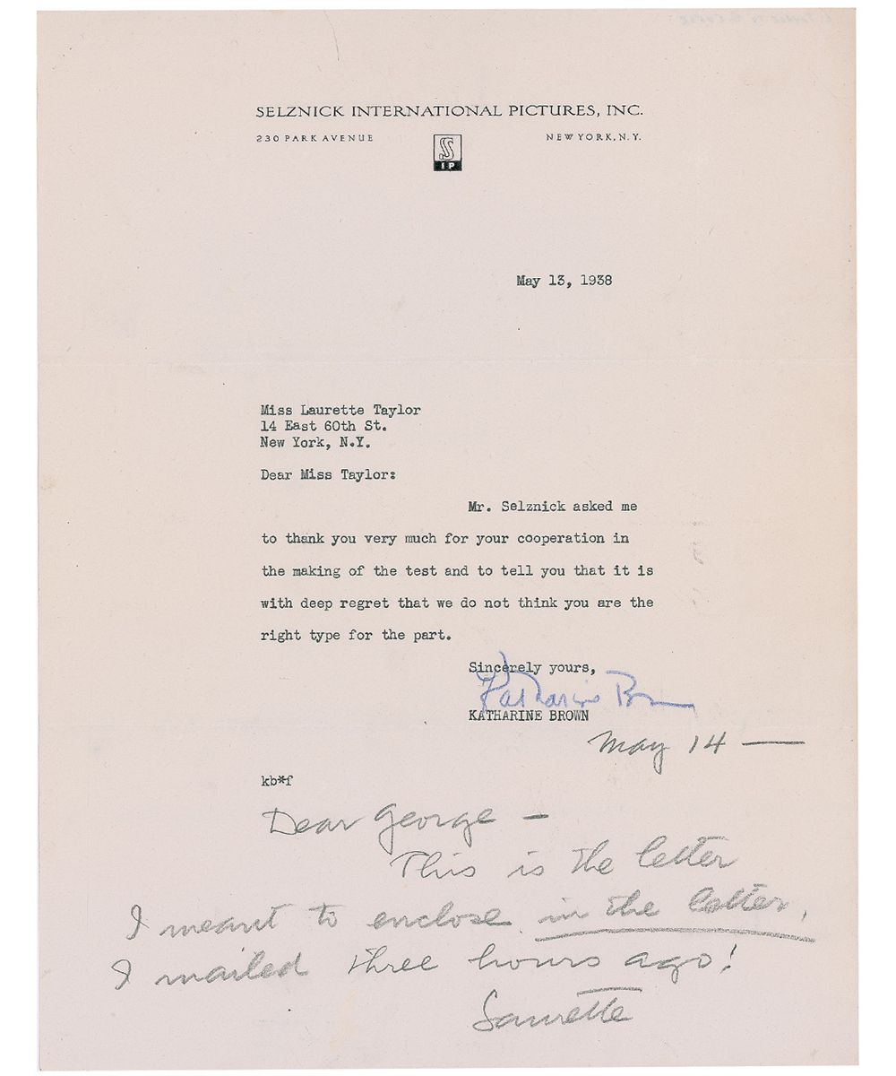 ALS in pencil signed “Laurette,” written at the bottom of a TLS to Taylor, one page, 8.5 x 11, Selznick International Pictures letterhead, May 14, 1938. A letter from Katharine Brown to Laurette Taylor telling her that she would not receive a part in Gone With the Wind. Letter to Taylor reads, in full: “Mr. Selznick asked me to thank you very much for your cooperation in the making of the test and to tell you that it is with deep regret that we do not think you are the right type for the part.” Taylor forwarded the letter to director George Cukor, and at the bottom Taylor writes, in full: “Dear George—This is the letter I meant to enclose in the letter I mailed three hours ago! Laurette.” Intersecting folds, scattered light creasing, staple holes to the upper left, and a stray pencil mark to the top, otherwise fine condition.