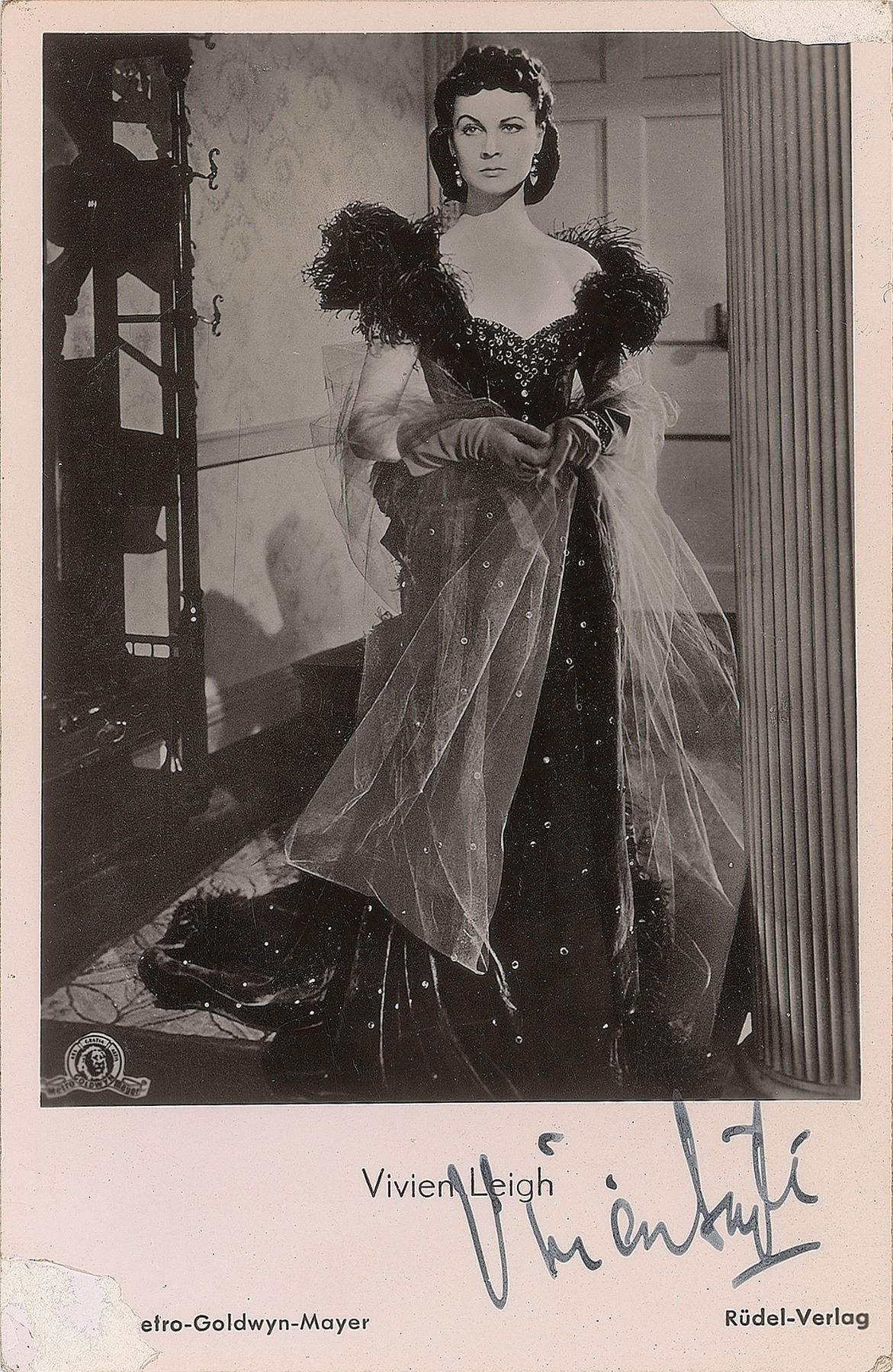 Two items: a vintage glossy 3.5 x 5.5 German postcard photo of Leigh as Scarlett O'Hara, signed below in fountain pen, "Vivien Leigh"; and a glossy 4 x 5.75 half-length photo of De Havilland as Melanie Hamilton, signed in the lower border in blue ink, "Very best wishes, Olivia de Havilland." In overall fine condition, with emulsion loss to two corners of the Leigh photo.