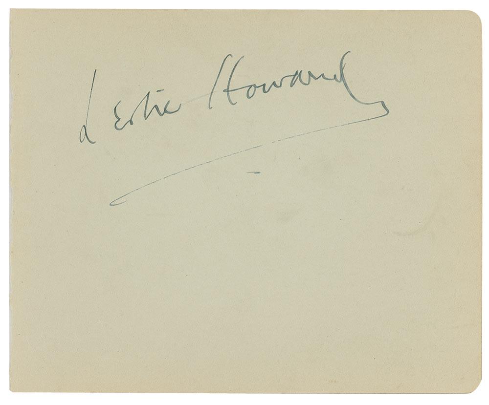 Large and crisp vintage fountain pen signature, “Leslie Howard,” on a light green 6.5 x 5.25 album page. In fine condition, with some light toning to edges.