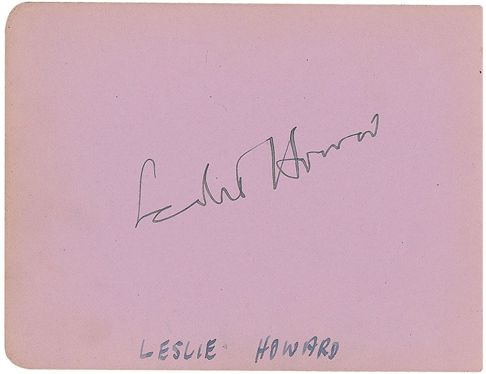 Vintage fountain pen signature, “Leslie Howard,” on a light purple 5 x 3.75 album page with a collector’s notation along the bottom edge. In fine condition.