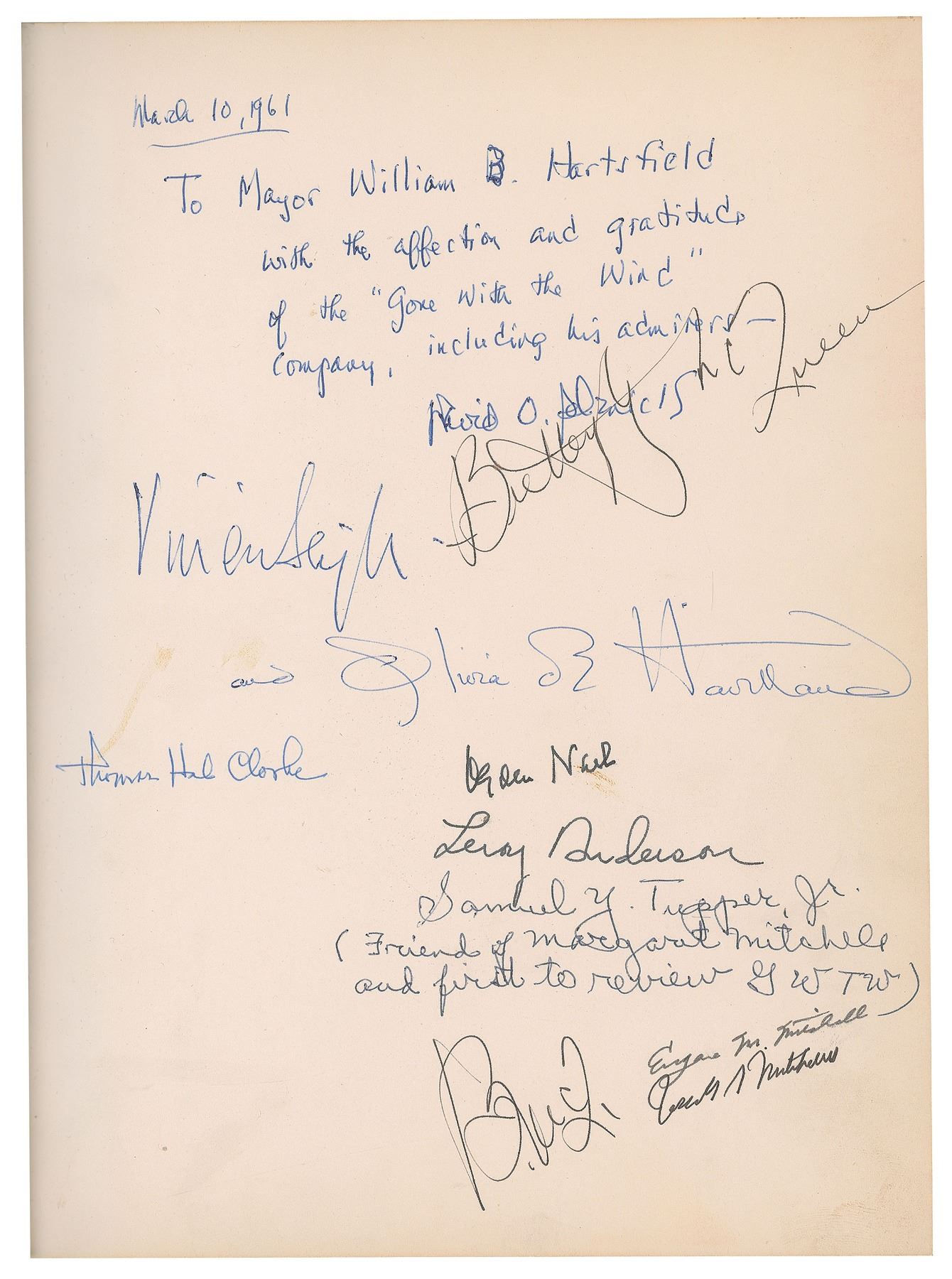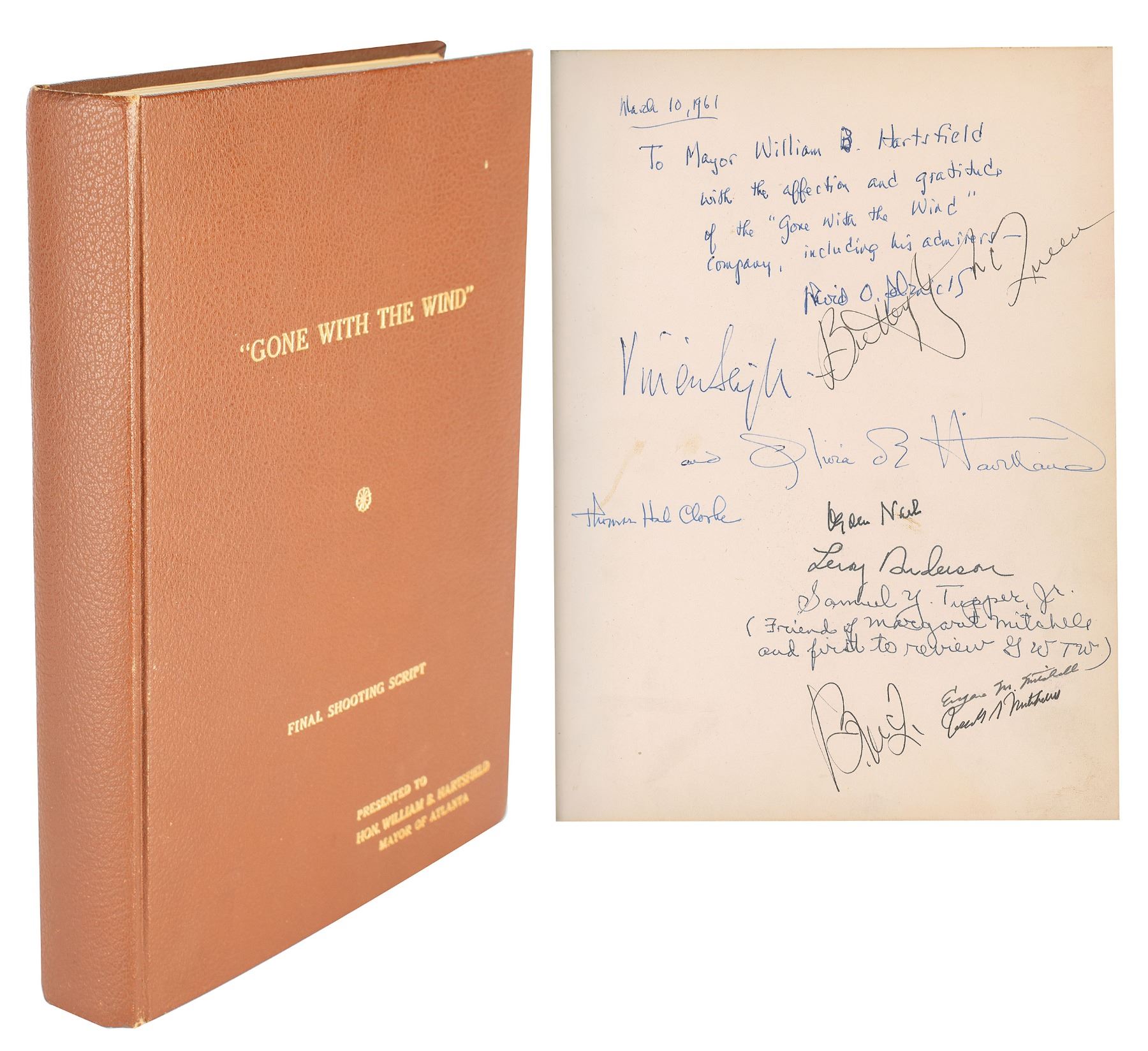 Remarkable presentation script for Gone With the Wind prepared by producer David O. Selznick circa 1958–1961 and given to Mayor William Hartsfield of Atlanta. Gilt-stamped hardcover, 8.75 x 11.25, 273 pages. Signed and inscribed on a free end page in blue ballpoint, "March 10, 1961, To Mayor William B. Hartsfield, with the affection and gratitude of the 'Gone With the Wind' company, including his admirer—David O. Selznick," "Vivien Leigh," "Butterfly McQueen," and "Olivia de Havilland." Additionally signed by notable people who are part of Gone With the Wind history such as Samuel Tupper (a friend of Mitchell whose review of her novel was the first to be published), humorist Ogden Nash (Selznick was considering him to write the book for the planned GWTW musical), Leroy Anderson (one of America’s premier composers with whom Selznick was discussing the Wind musical), and Eugene and Joseph Mitchell (Margaret Mitchell’s nephews). In fine condition.