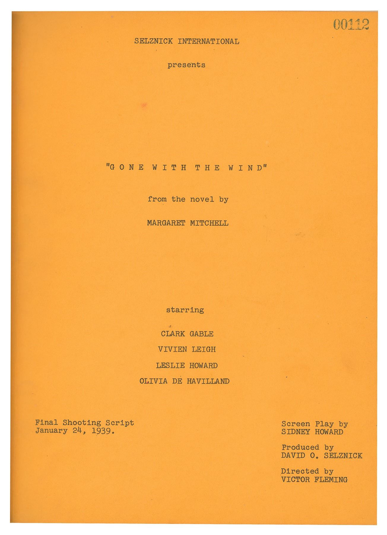 In 1939, David O. Selznick had a certain number of the finished Gone With the Wind scripts nicely bound to give as gifts to special recipients after the incredible Atlanta gala premiere extravaganza. He was, in fact, known for doing this after some of his productions. Perhaps in preparation for the twentieth anniversary (1959) of GWTW’s Atlanta premiere, or in preparation for the 1961 gala, special re-premiere in Atlanta, Selznick had a number of script copies made (thought to be fifty) for his company somewhere around 1958-1960. These scripts begin with number 00100 and after many years, ten of these scripts are known to collectors to have reached the market with mixed numbers in the range from 00108 to 00141. The script offered here (#00112) is one of the finest examples of exceptional, one-of-a-kind scripts in the realm of GWTW history.
