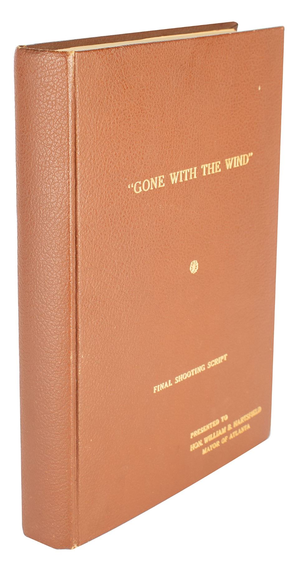 This superb, 273 page, final shooting script is beautifully bound in chocolate brown pebble leather in deluxe Selznick style. On the front cover is the film's title and “Final Shooting Script” in gilt as well as, “Presented To Hon. William B. Hartsfield, Mayor of Atlanta.” A superlative presentation to commemorate the gala 1961 celebrations and the fact that Hartsfield held a unique and special place in the film’s Atlanta history. Mayor Hartsfield was also Atlanta’s mayor during the historic, world famous 1939 gala premiere.