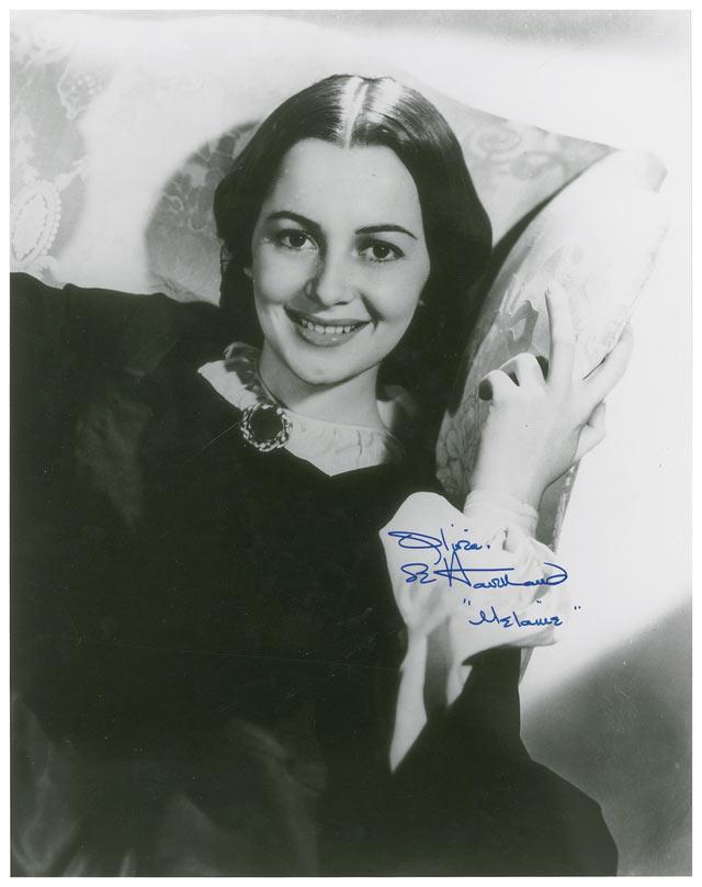Glossy 11 x 14 photo of de Havilland as Melanie, signed in blue felt tip, “Olivia de Havilland, ‘Melanie.’” In fine condition.