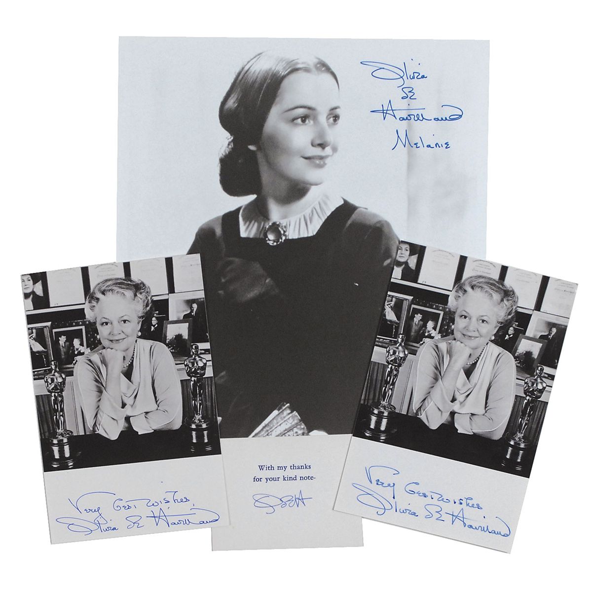 Four items: one glossy 8 x 10 photo of de Havilland as Melanie in Gone With the Wind, signed in blue felt tip; two glossy 4 x 6 photos of an older de Havilland, each signed in blue felt tip; and one printed note, signed with her initials in blue ink. In overall fine condition.