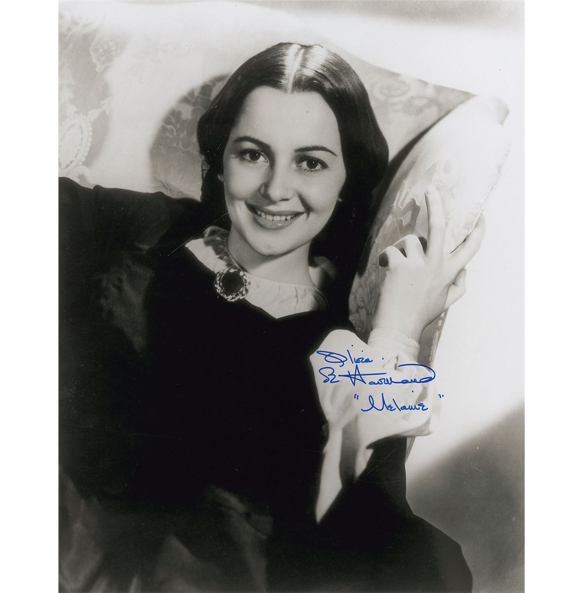 Glossy 11 x 14 photo of the actress in her Gone With the Wind role, signed in blue felt tip, “Olivia de Havilland, ‘Melanie.’” In fine condition.