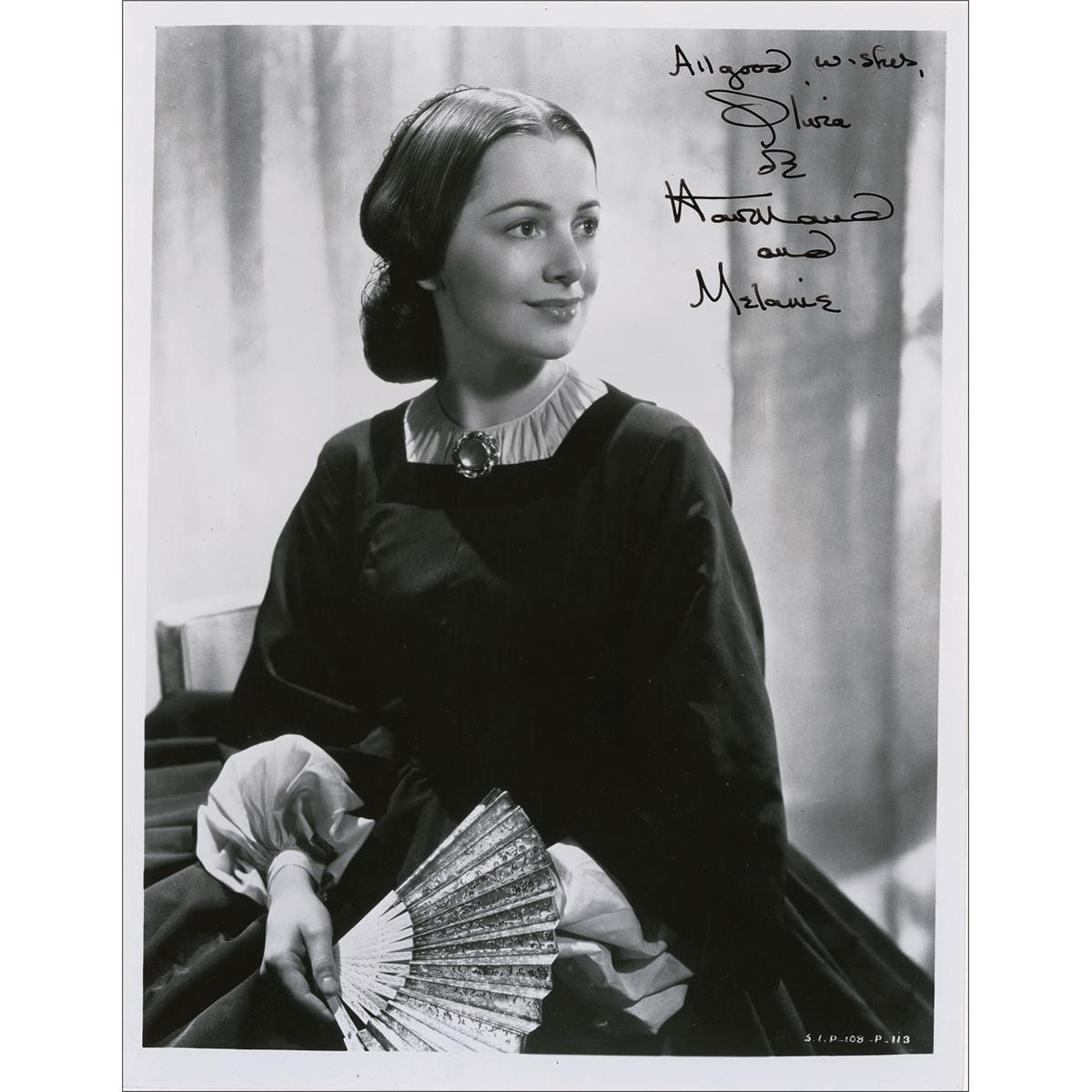 Glossy 8 x 10 photo of de Havilland in character from Gone With the Wind, signed in black felt tip, “All good wishes, Olivia de Havilland and Melanie.” In fine condition.