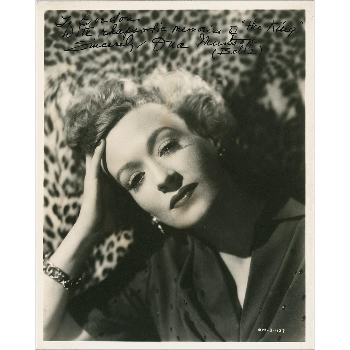 Actress who played Belle Watling in GWTW; she committed suicide at age 49 from an overdose of sleeping pills. Vintage matte-finish 8 x 10 photo, signed and inscribed in fountain pen “To Gordon, with rhapsodic memories of ‘the King’ Sincerely, Ona Munson (Belle).” In fine condition.
