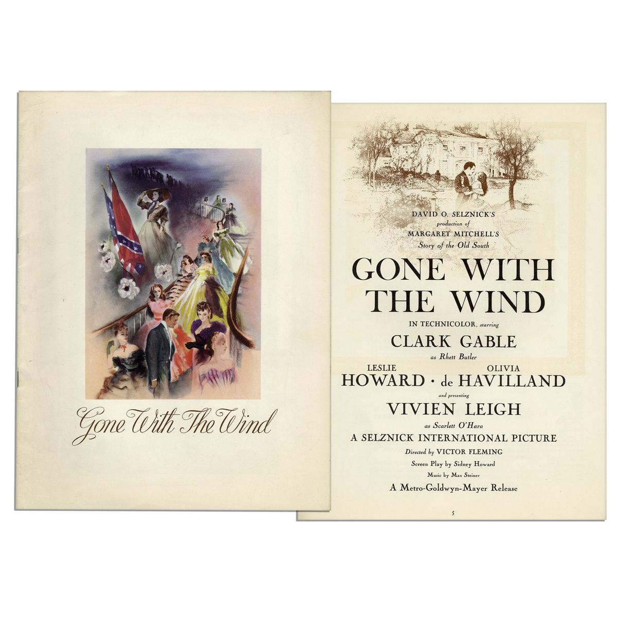 Vividly illustrated ''Gone With The Wind'' movie program featuring cast bios and articles written by Vivien Leigh and Clark Gable on playing the iconic roles of Scarlett O'Hara and Rhett Butler. Twenty page program was available for purchase for 25 cents at movie theaters showing the film in 1939. It also features production notes and more than a dozen color sketches and photographs. Measures 9'' x 12.'' Near fine. Lot also includes a two page brochure, possibly handed out for free; 3'' triangular chip to upper right, else fine.