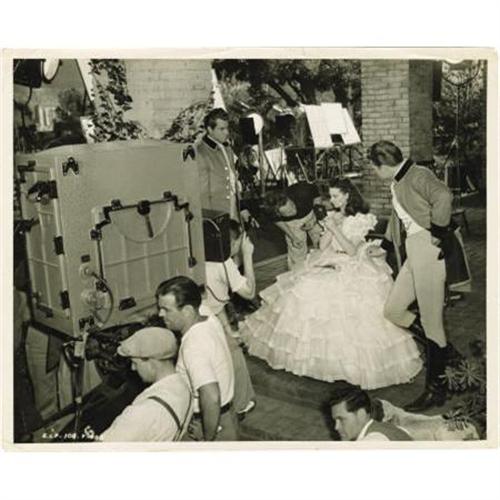<B>"Gone With the Wind" Rare Set Photo.</B></I> A rare vintage b&w 8" x 10" promo photo of Vivien Leigh touching up her make-up inbetween takes on the set of the 1939 Civil War epic that shot her to stardom. Also visible in the photo are actors George Reeves, make-up artist Eddie Allen, cameraman Ernest Haller, and other crew members. The photo is in Very Fine condition with mild to moderate wear and creasing to the edges and corners.<BR><BR><b>Shipping:</b> Flat Material, Small (<a target="_blank" href="http://www.heritageauctions.com/common/shipping.php">view shipping information</a>)