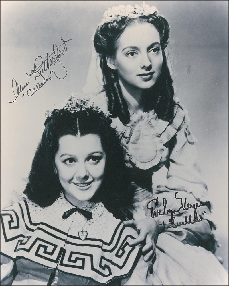 Glossy 8 x 10 photo of Rutherford and Keyes as they appeared in Gone With the Wind, signed in black felt tip by both Evelyn Keyes and Ann Rutherford, with both actresses adding their respective character names. In fine condition.