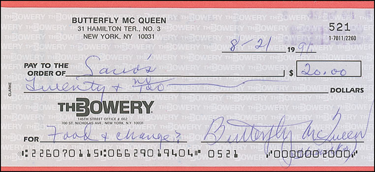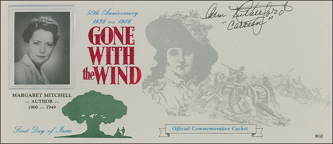 Two items: commemorative cover, 9.5 x 4, bearing a cachet honoring the 50th anniversary of Gone With the Wind and Margaret Mitchell, signed in black ink, “Ann Rutherford ‘Carreen’”; and a personal check, filled out and signed by Butterfly McQueen, payable to Sano’s for $20.00, dated August 21, 1991. In fine overall condition.