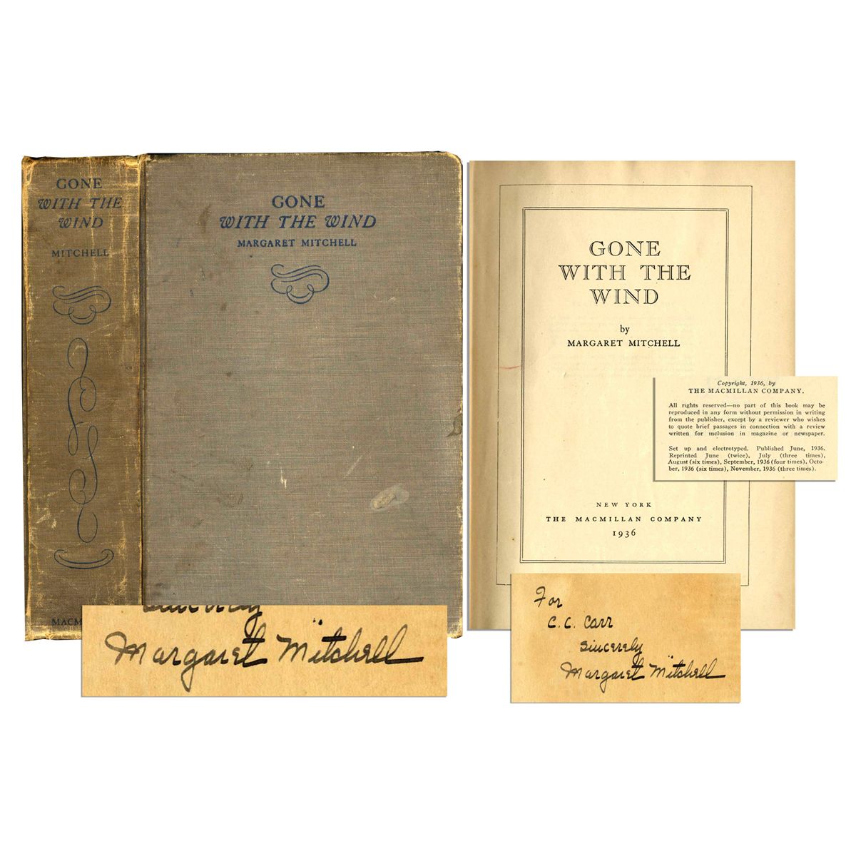 ''Gone With The Wind'' first edition hardcover signed by Margaret Mitchell. Macmillan: New York: 1936. Autographed front free endpaper reads in full, ''For C.C. Carr / Sincerely, Margaret Mitchell''. The inscription and signature are inked in black. This 1037pp. novel is bound in green-gray cloth boards with lettering and flourish designs in dark blue. In good condition, with age toning to endpapers and edges. A few small stains to the front board and a moisture stained area to the back board. Measures 6'' x 8.5''. An increasingly rare first edition signed.