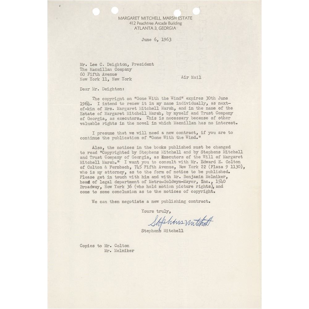 Interesting TLS, one page, 7.25 x 10.5, Margaret Mitchell Marsh Estate letterhead, June 6, 1963. Letter to Lee C. Deighton, the president of the Macmillan Company, in full: "The copyright on 'Gone With the Wind' expires 30th June 1964. I intend to renew it in my name individually, as next-of-kin of Mrs. Margaret Mitchell Marsh, and in the name of the Estate of Margaret Mitchell Marsh, by myself and Trust Company of Georgia, as executors. This is necessary because of other valuable rights in the novel in which Macmillan has no interest. I presume that we will need a new contract, if you are to continue the publication of 'Gone With the Wind.' Also, the notices in the books published must be changed to read 'Copyrighted by Stephens Mitchell and by Stephens Mitchell and Trust Company of Georgia, as Executors of the Will of Margaret Mitchell Marsh.' I want you to consult with Mr. Edward E. Colton of Colton & Fernbach, 745 Fifth Avenue, New York 22 (Plaza 9 1130), who is my attorney, as to the form of notice to be published. Please get in touch with him and Mr. Benjamin Melniker, head of legal department of Metro-Goldwyn-Mayer, Inc., 1540 Broadway, New York 36 (who hold motion picture rights), and come to some conclusion as to the notices of copyright. We can then negotiate a new publishing contract." In fine condition. Accompanied by a TLS from Deighton, dated June 6, 1963, forwarding the Stephens Mitchell letter to Bella L. Linden and noting that it "contains a proposal concerning renewal of copyright which appears to us to encounter some extremely difficult legal obstructions."
