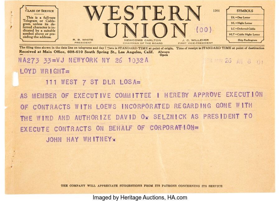 Gone With the WindTelegram To David O. Selznick (1938).A historic telegram authorizing producer David O. Selznick to enter into contracts with Loews, Inc. for the Civil War epic.