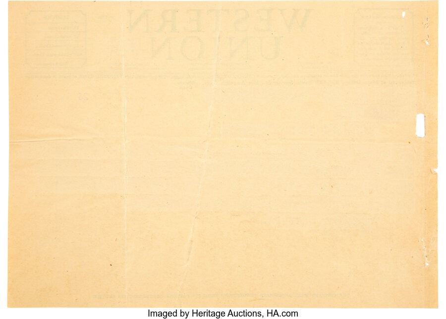 David O. Selznick wanted Clark Gable to play the role of Rhett Butler, but since Gable was contracted to MGM and therefore unavailable, Selznick forged an agreement with Loew's -- MGM's parent company -- to help finance the film, share profits, and loan out Gable. Telegram measures 8" x 5.75". Light wear and creasing (along with chipping and holes), otherwise Near Fine condition. COA from Heritage Auctions.