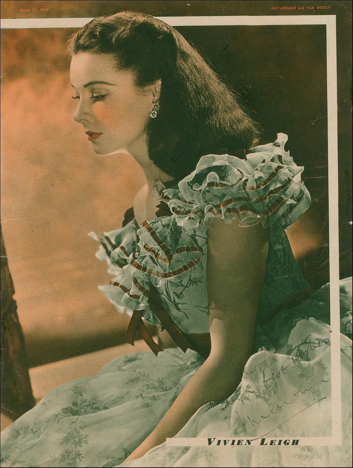 Color vintage 9 x 11.75 Picturegoer and Film Weekly magazine photo of Leigh as Scarlett O’Hara, taken from the March 23, 1940 issue, signed and inscribed in fountain pen “Angela, With best wishes, Vivien Leigh.” In very good condition, with light contrast to signature and inscription, due to background and slightly decreased ink flow, tear to left edge, and scattered creasing and wrinkling. One of Hollywood’s most uncommon and desirable signed photographs in any form, even more so in color images.