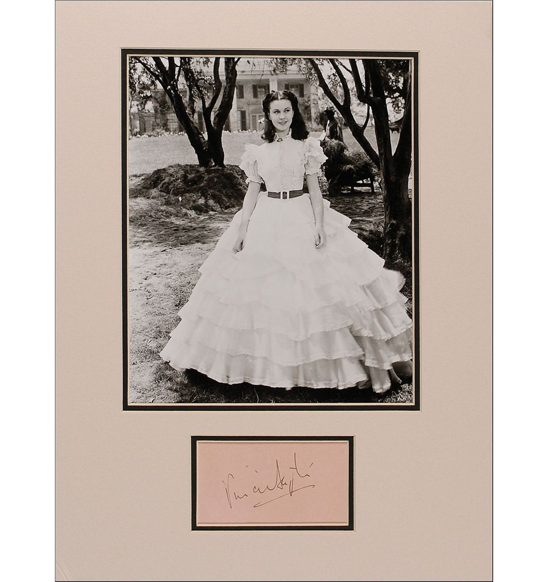 Vintage fountain pen signature, “Vivien Leigh,” on a light pink album page. Matted, with a glossy photo of Leigh as Scarlett O’Hara, to an overall size of 11.5 x 15.5. In fine condition.