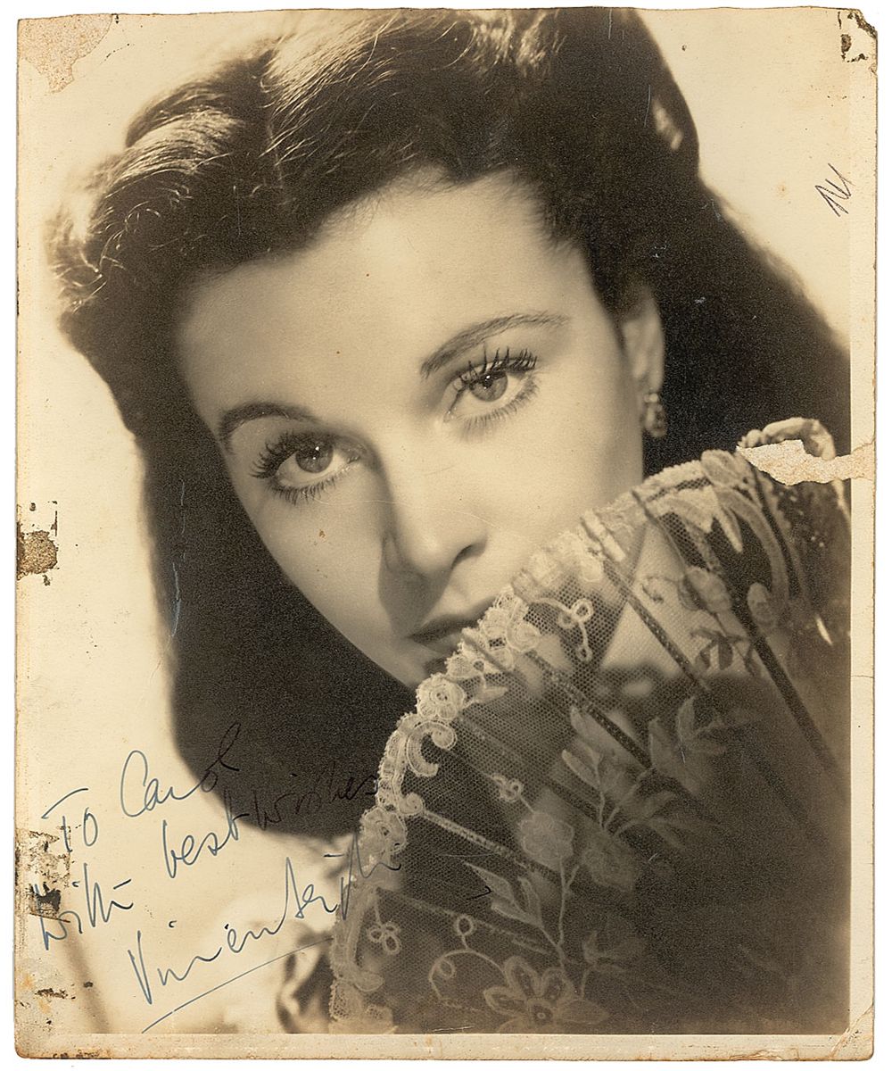 Rare vintage glossy 8 x 9.5 photo of Leigh as Scarlett O’Hara, signed and inscribed in fountain pen “To Carol, with best wishes, Vivien Leigh.” In good condition, with trimmed top edge, scattered creases, including one to upper portion of facial area, old tape and adhesive staining to edges, some lightly affecting portion of inscription and sentiment, small area of surface loss to right side, and a tack hole to three corner tips. One of Hollywood’s most uncommon and desirable signed photographs.