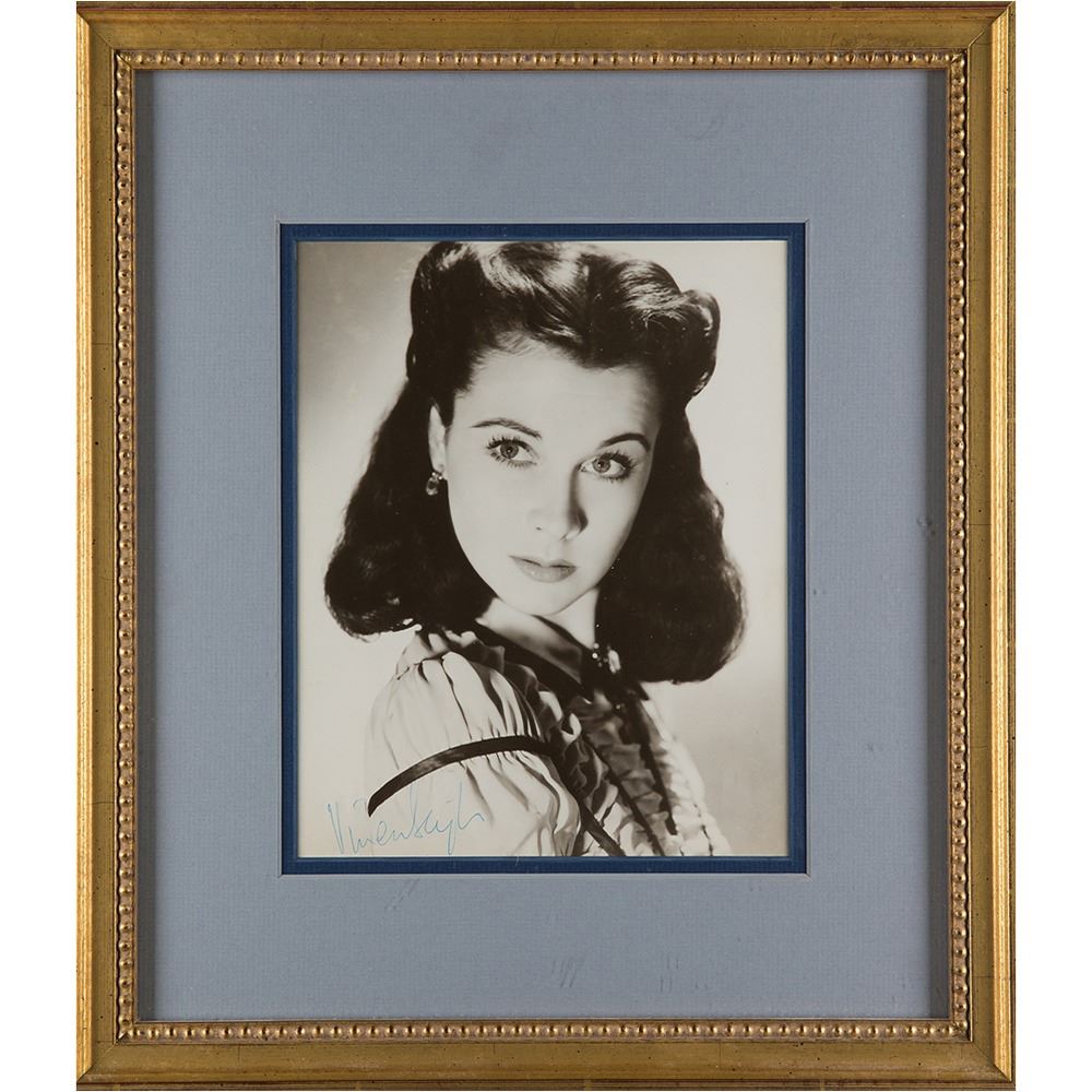Exquisite glossy 7.25 x 9 close-up photo of Leigh as Scarlett O'Hara from the 1939 classic Gone With the Wind, signed neatly in blue ballpoint. Archivally double-matted and framed with UV-resistant museum glass to an overall size of 14 x 16. In fine condition, with scattered light creasing. A highly desirable portrait of Leigh in her timeless Oscar-winning role.