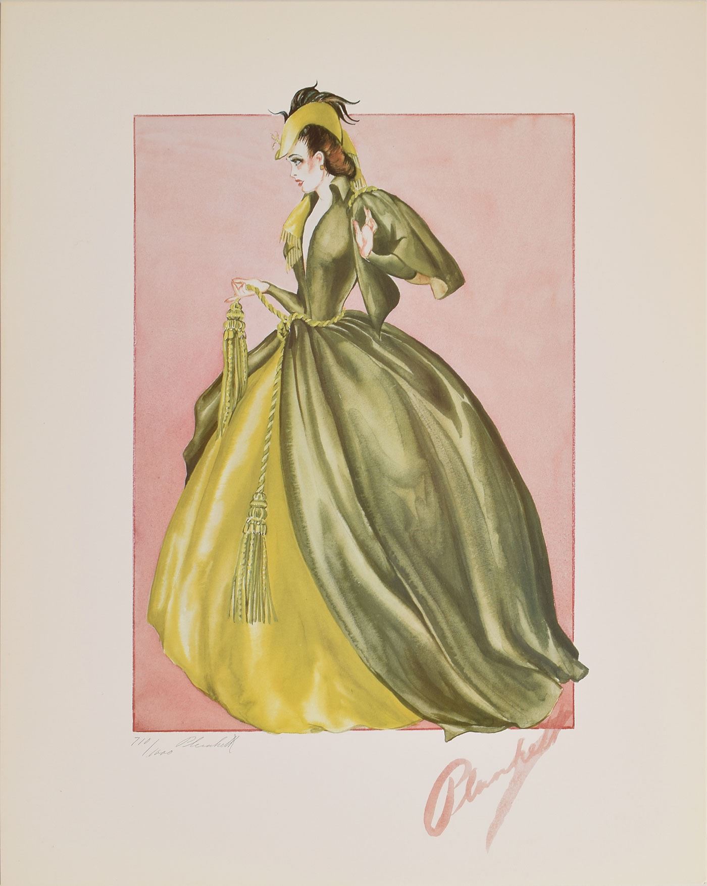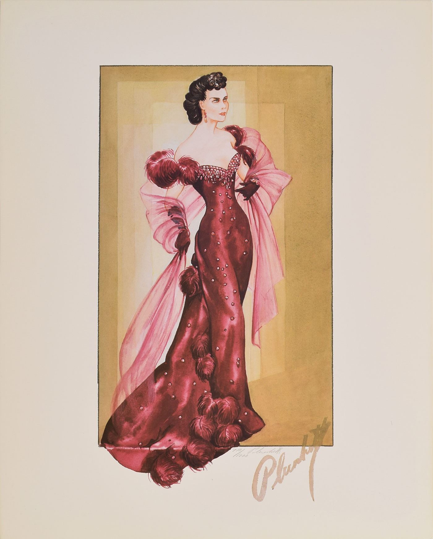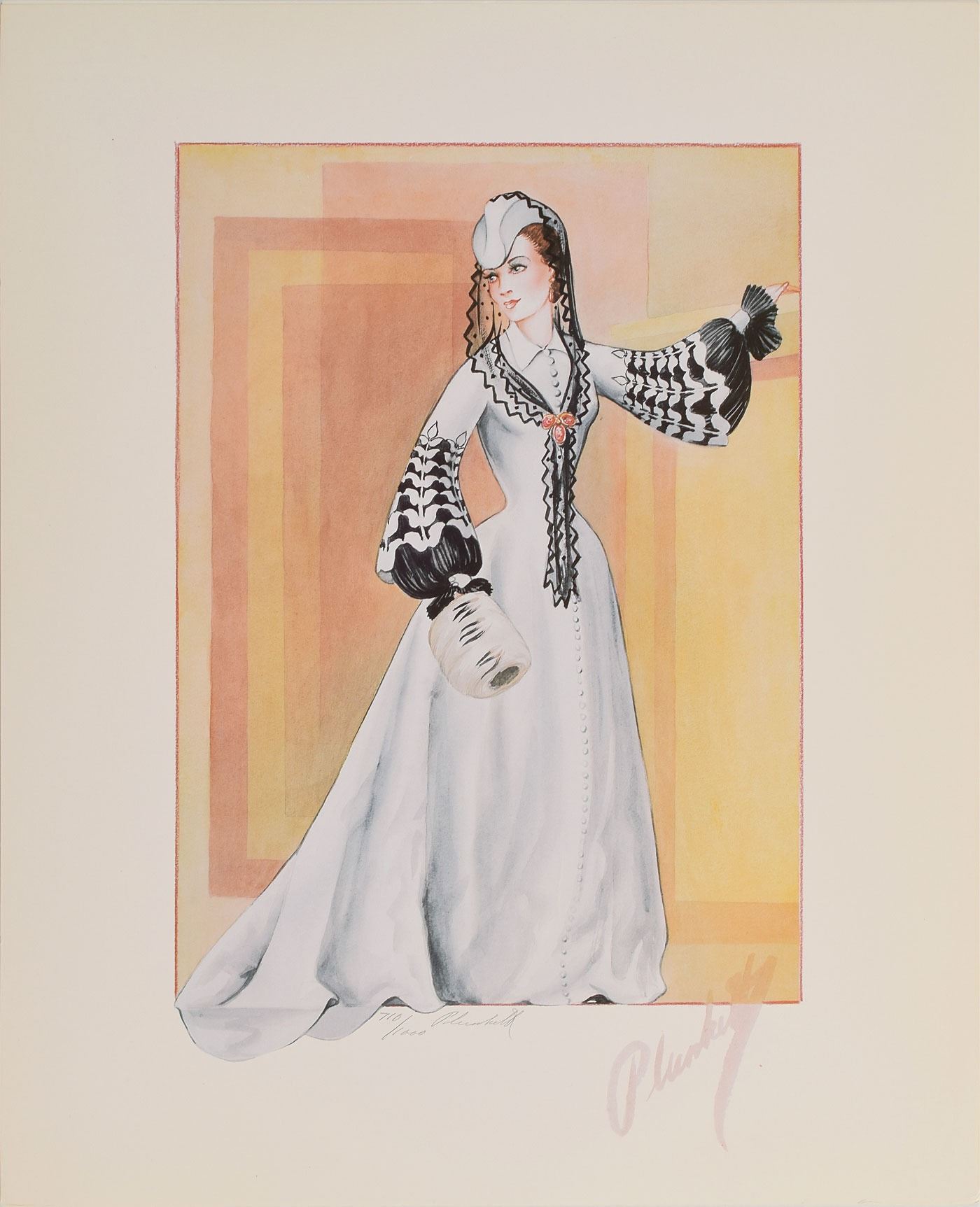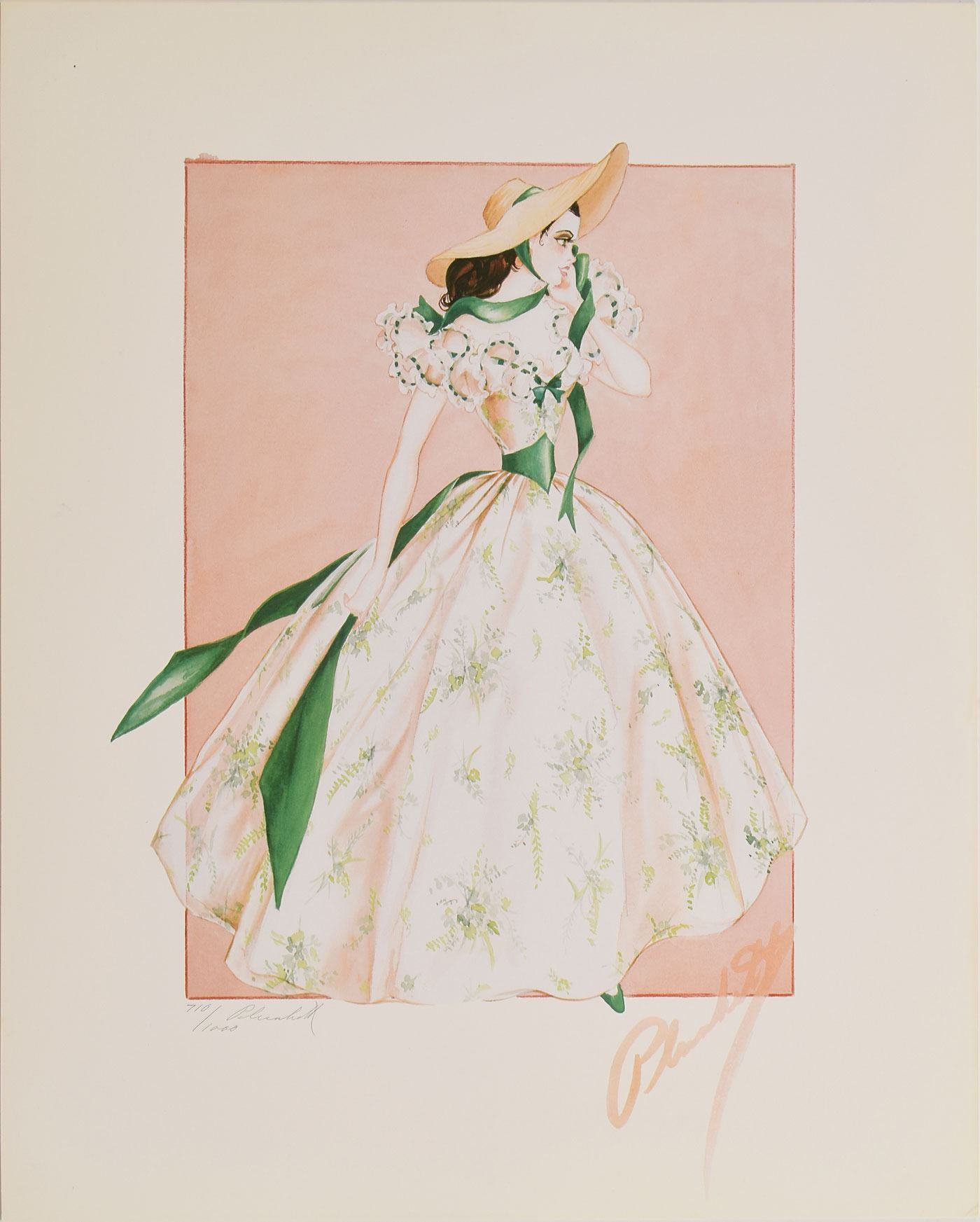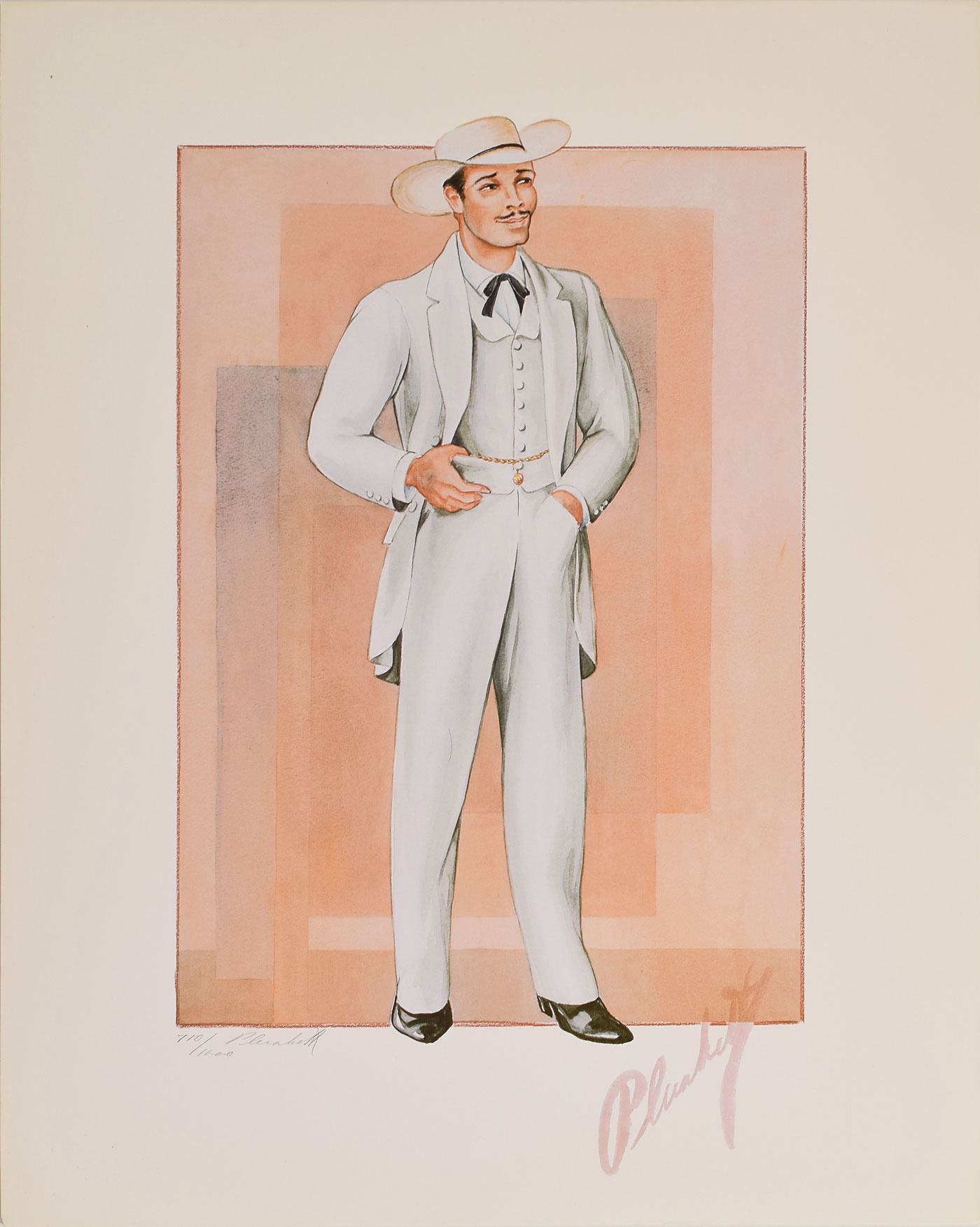 Prolific costume designer and Academy Award winner (1902–1982) who worked on more than 150 projects throughout his career in the Hollywood film industry, including King Kong and Gone With the Wind. Exceptional limited edition portfolio consisting of six color 16 x 20 prints of Plunkett’s costume designs for Gone with the Wind, numbered 710/1000, each signed in the lower border in pencil, “Plunkett.” The images are all full-length depictions of the concepts, with five showing luxurious gowns for Scarlett O’Hara and the sixth a dapper suit for Rhett Butler. Contained within the large original portfolio envelope, with an additional plate featuring a complete list of the many films for which Plunkett designed costumes. The film listing page has some damage to its edges and corners and a presentation inscription in an unknown hand; the prints themselves, however, are all in fine to very fine condition.