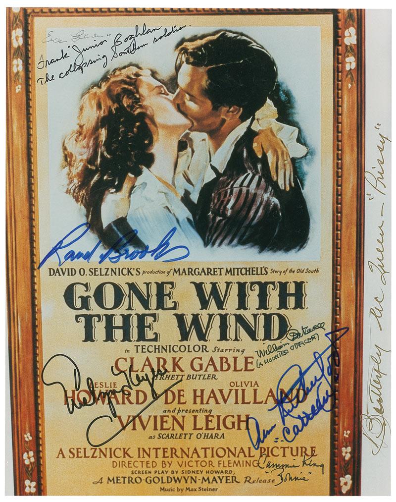 Color glossy 8 x 10 photo of a Gone With the Wind movie poster, signed in felt tip and ink by eight cast members. Signers are: Eric Linden, Frank Coghlan, Rand Brooks, Evelyn Keyes, Ann Rutherford, Cammie King, William Bakewell, and Butterfly McQueen. In fine condition, with a few scattered light creases.