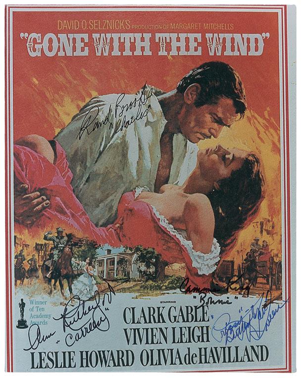 Color glossy 8 x 10 photo of a film poster for Gone with the Wind, signed in blue and black felt tip by Ann Rutherford, Cammie King, Rand Brooks, and Butterfly McQueen, each adding their character names. In fine condition, with some light contrast to King’s signature. Accompanied by a full letter of authenticity from PSA/DNA.