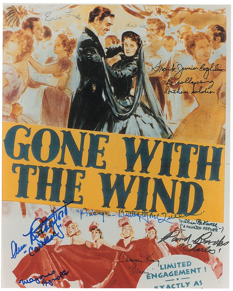 Color glossy 8 x 10 photo of a Gone With the Wind poster, signed in felt tip and ballpoint by eight cast members. Signers are: Eric Linden, Frank ‘Junior’ Coghlan, Ann Rutherford, Butterfly McQueen, William Bakewell, Rand Brooks, Cammie King, and Marjorie Reynolds. Most have added the name of their character below their signature. In fine condition.
