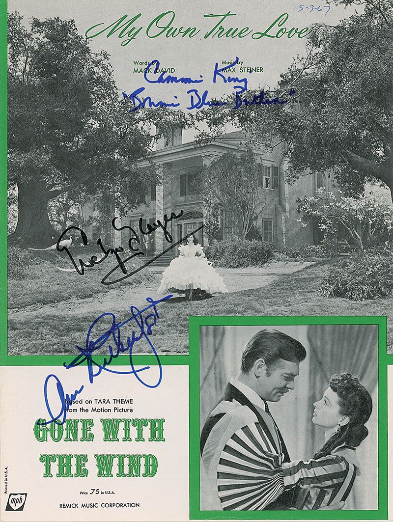 Sheet music for ‘My Own True Love’ from Gone With the Wind, 9 x 12, two pages, signed on the front cover in blue felt tip, “Cammie King, ‘Bonnie Blue Butler’” and “Ann Rutherford,” and black felt tip, “Evelyn Keyes.” In fine condition, with a ballpoint no