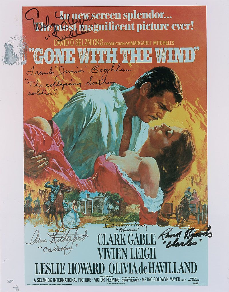 Color glossy 8 x 10 photo of a Gone With the Wind film poster, signed in felt tip and ink by five actors and actresses from the film: Evelyn Keyes, Ann Rutherford, Rand Brooks, Cammie King, and Frank Coghlan, each adding their character names. Some creases and paper remnants to left side, otherwise fine condition.